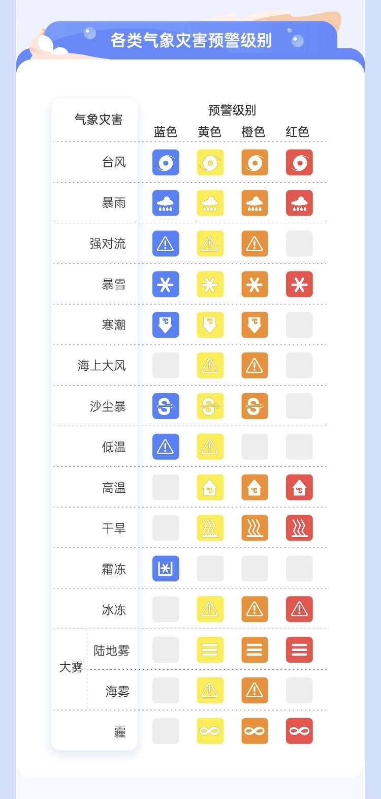 2010年4月,气象灾害预警增至13类。每类气象灾害预警最多设4个级别,分别以蓝、黄、橙、红四种颜色表示。
