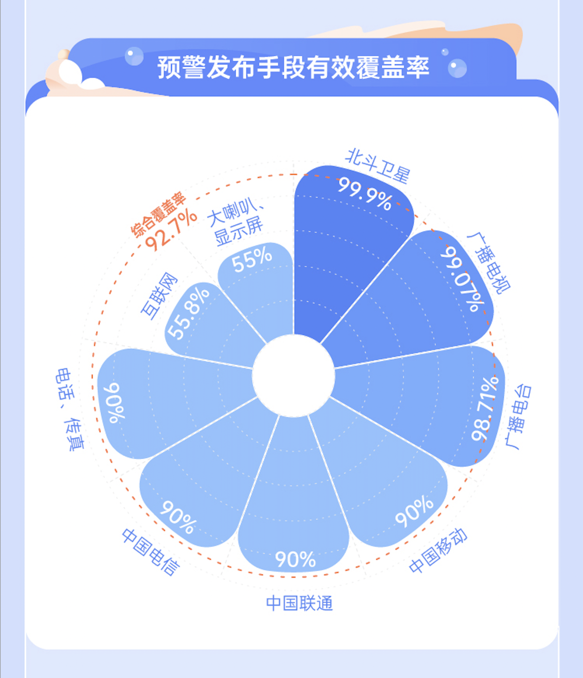 便捷、高效、广覆盖的信息获取渠道是“早行动”的前提条件之一。数据显示,手机短信、广播、电视、互联网或智能终端,都是公众获取预警信息的便捷渠道。在多渠道发布手段的配合下,预警的公众综合覆盖率达到92.7%。