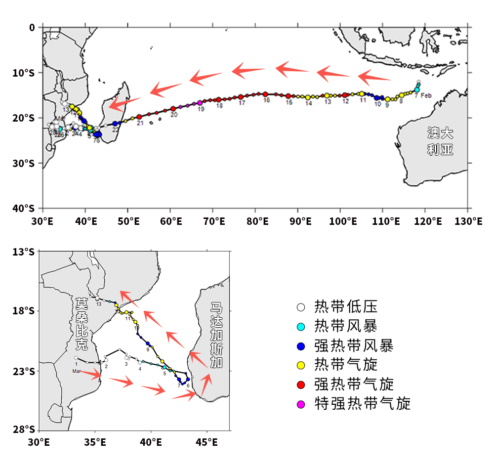 “弗雷迪”路径强度图(热带气旋等级按照《全球热带气旋等级》(GB/T 32935-2016)确定)