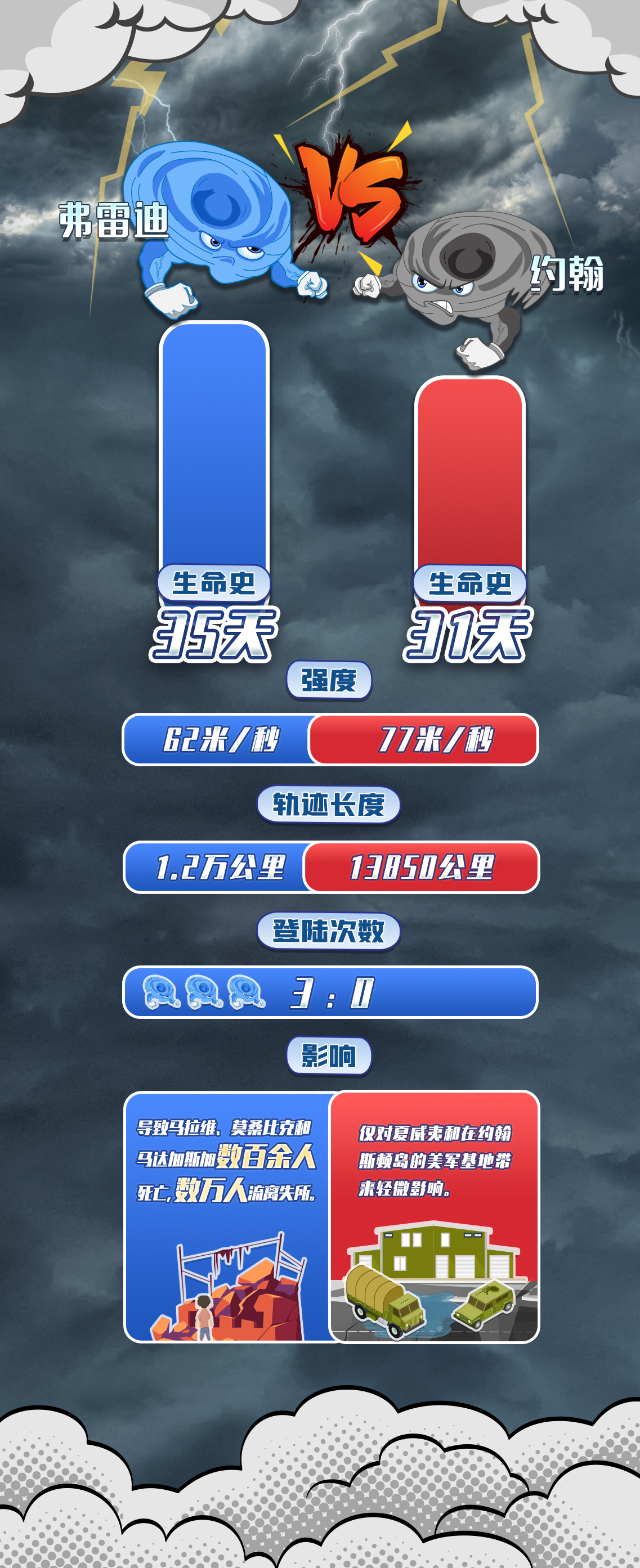 在影响方面,“约翰”远逊于“弗雷迪”。在长达一个月的生命史内,“约翰”没有登陆,仅对夏威夷群岛和在约翰斯顿岛的美军基地有较轻影响。而“弗雷迪”持续影响马拉维、莫桑比克和马达加斯加等国,其带来的强降雨和强风天气造成洪灾、风灾、山体滑坡和泥石流等气象与地质灾害,导致数百人死亡,数万人流离失所。