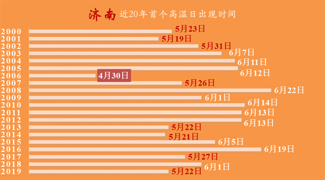 其实,根据数据,北方一些地区高温日最多的月份就在6月和7月。2000-2019年近20年数据显示,济南首个高温日出现在6月的年份最多,占11年;出现在5月占8年;2006年则早在4月30日就出现了当年的首个高温天。6月和7月是济南高温多发月,占到全年高温日数的近80%。其中平均每年6月都会出现6天以上35℃高温天。