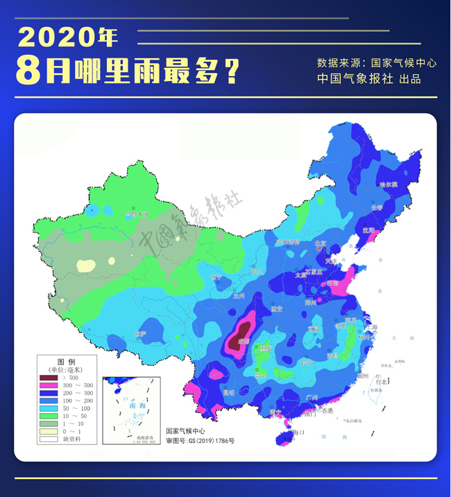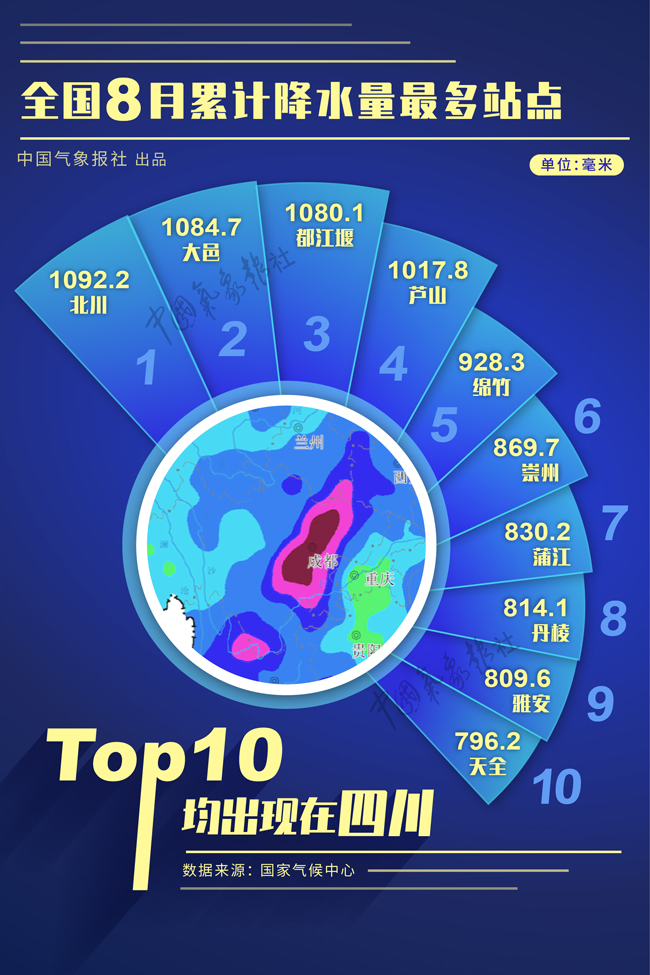 8月,四川省平均降雨量339.7毫米,较常年同期偏多84.2%,为1961年以来同期最多;甘肃省平均降雨量153.3毫米,较常年同期偏多99.2%,为1961年以来同期最多。