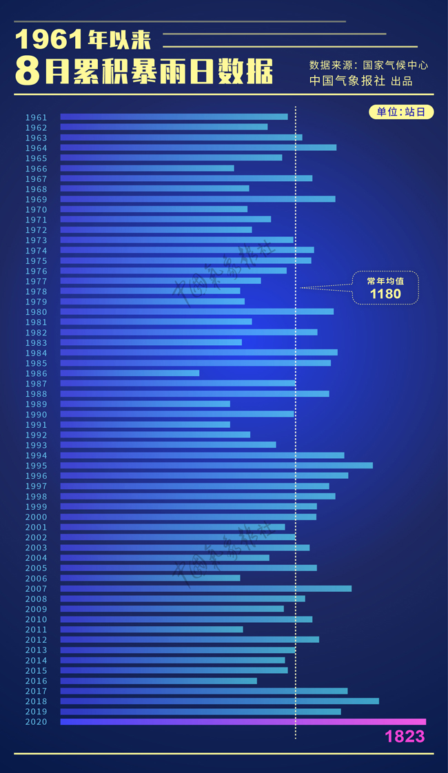 8月,全国平均暴雨日数为0.44天,较常年同期偏多0.17天,为1961年以来同期最多;累计暴雨站日数为1823,较常年同期偏多54.6%,为1961年以来同期最多。