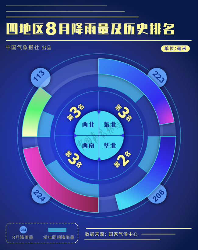 8月,我国北方地区平均降水量152毫米,较常年同期偏多63%,为1961年同期最多。其中,华北地区平均降水量206.0毫米,较常年同期偏多79.9%,为1961年以来同期第二多;东北、西北、西南地区平均降水量分别为222.6毫米、112.6毫米、223.9毫米,分别较常年同期偏多65.6%、62.3%和32.4%,均为1961年以来同期第三多。