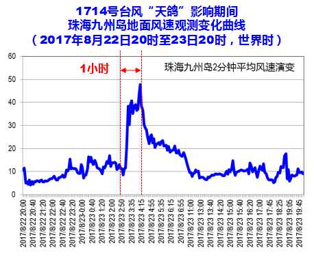 2017年8月22日,台风“天鸽”影响期间珠海九州岛地面风速观测变化曲线。