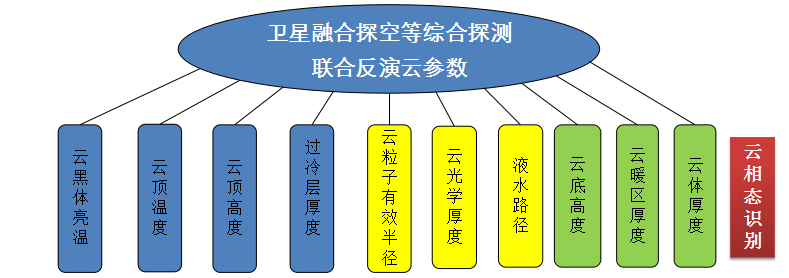 项目团队融合“风云四号”卫星资料、业务实时L波段探空资料以及地面观测资料开发了人影业务人员最为关心的云底高度、过冷层厚度、暖区厚度及云体厚度等参量产品。为满足人影对云微观物理特征参数反演的精度需求,团队还开发了冰云、过冷水等相态识别的人影微观云物理特征参数反演算法。